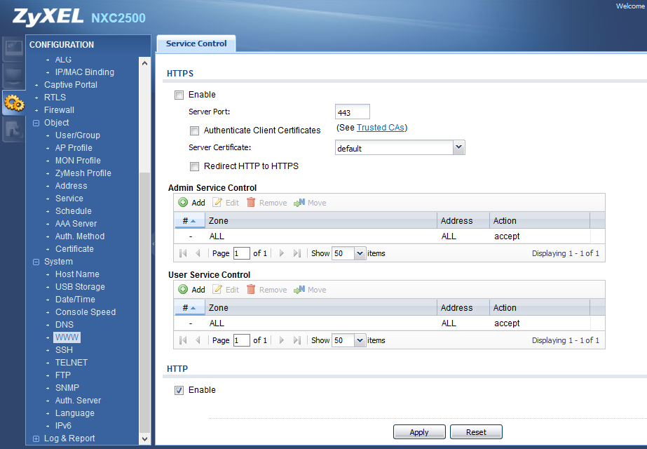 7. Отключите использование протокола HTTPS на контроллере (меню System > WWW > Service Control).