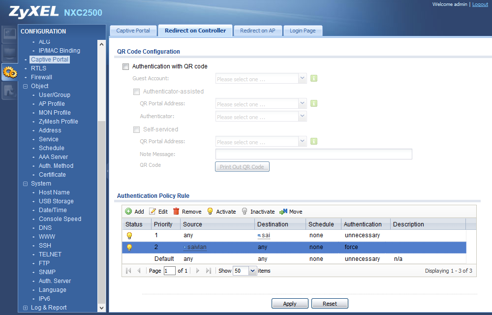 11. Настройте Authentication Policy Rule в разделе Redirect on Controller (перенаправления на контроллере) в меню Captive Portal.