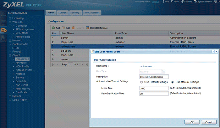 12. Настройка ограничения длительности сессии. При необходимости установить ограничение интернет-сессии Wi-Fi клиентов, укажите в поле Reauthentication Time значение длительности в минутах, отличное от нуля. Для этого надо обратиться к разделу Configuration > Object > User/Group и щёлкнуть на radius-users, чтобы открыть окно с настройками пользователей сервера RADIUS.