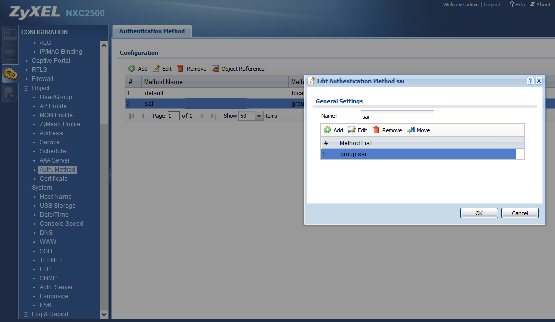 8. Создайте метод Аутентификации, в котором укажите созданную ранее учётную запись с сервером RADIUS (в нашем примере sai). Сделать это можно в меню Object > Auth. Method > Authentication Method.