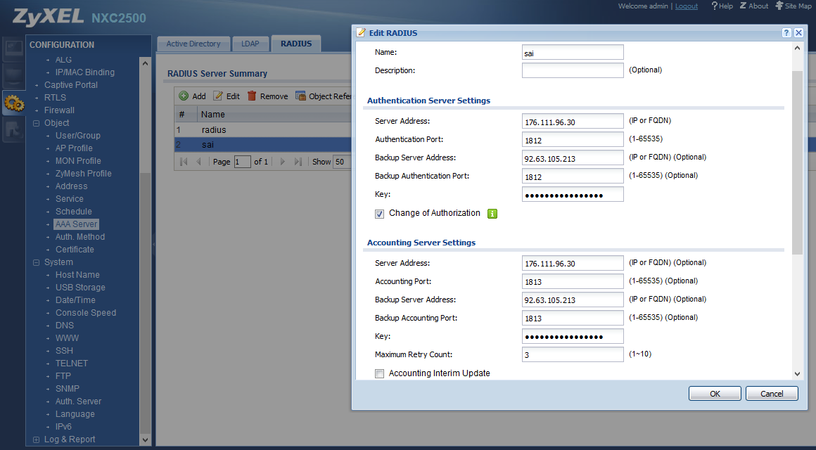 В поле Name впишите произвольное название этой записи с настройками, например, sai. Укажите адрес основного сервера RADIUS 176.111.96.30 и резервного 92.63.105.213, как показано на скриншоте ниже. Для работы сервиса RADIUS используется стандартный номер порта 1812. В поле Key впишите пароль (секретное слово), которое используется для шифрования сообщений между сервером RADIUS и контроллером NXC. Ниже в этом же окне впишите в поле NAS IP Address адрес сервера RADIUS 176.111.96.30, а в поле NAS Identifier – имя устройства NAS ID, используемое для идентификации в САИ-WiFi. Оба значения, Key и NAS ID, нужно взять из личного кабинета сервиса "САИ-WiFi".